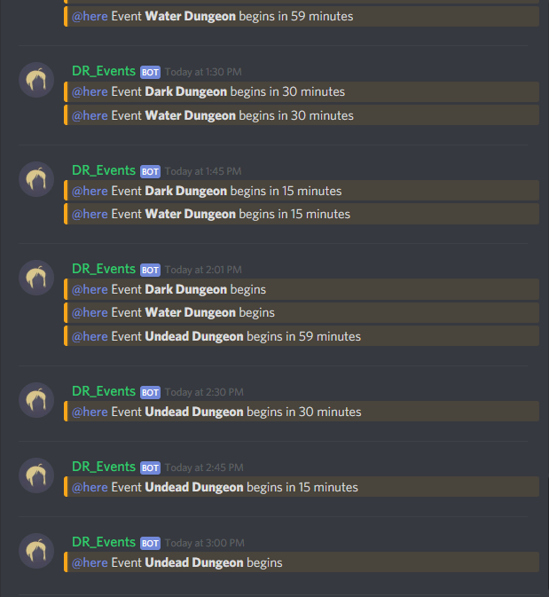 So i have a event bot fully working on Order66 guild discord and would like to see something implemented on the DRG Discord it would be help to all member when the times change for the event and the Event GMs can easily add there events to it. maybe to increase participation