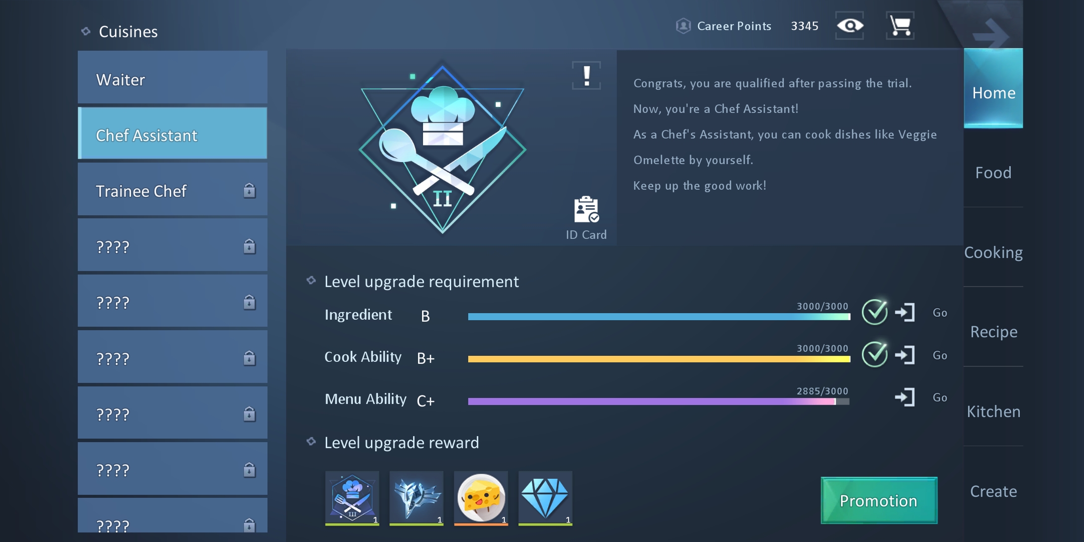 I already learned all the recipes needed for chef assistant and I aready tried making dark cuisines and making few things like learning spring rolls which is supposed to be learn when you're trainee chef but still its not enough experience to have the promotion. I think this is a bug help please.